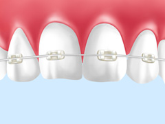 ワイヤーも白い物を選択できるので、目立ちにくいのが特徴です。メタルブラケットに比べると強度が多少低く、治療費はやや高めですが、メタルブラケット同様の高い効果が得られ、矯正期間もほぼ同じです。
